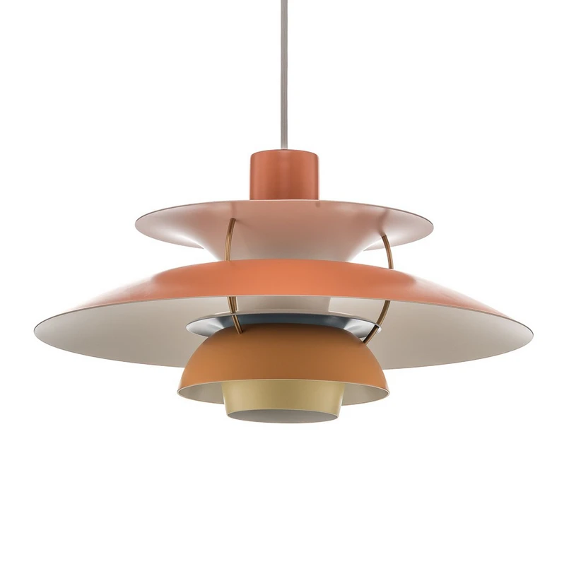 La PH 5 est disponible dans une large gamme de magnifiques couleurs et les différentes nuances de couleurs des cinq abats-jours de la lampe créent un effet dynamique gradué, qui renforce l'impact visuel de la Suspension.